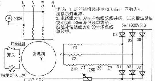 柴油發(fā)電機(jī)組實(shí)質(zhì)是臺三次諧波自勵磁凸式三相四線同步發(fā)電機(jī),因具有輸出功率大、適合移動等優(yōu)點(diǎn),故廣泛用于廠礦、工程施工等場合。雖然功率不同的發(fā)電機(jī),其繞組數(shù)據(jù)有所不同,但電路連接基本相同。